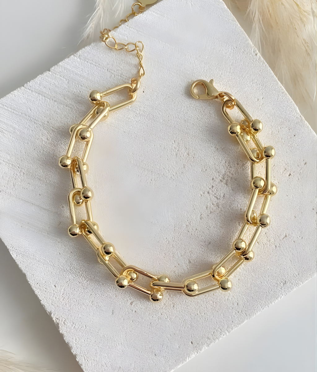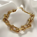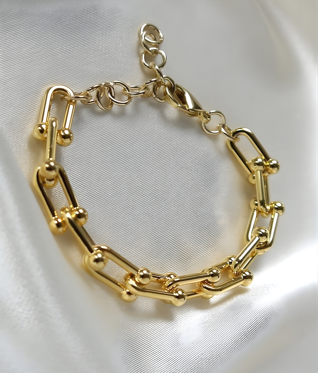 The Nova Link Bracelet features sleek geometric links with polished gold accents for a bold yet refined look. Lightweight and versatile, it’s perfect for everyday wear—whether styled solo or layered for a modern, chic finish.